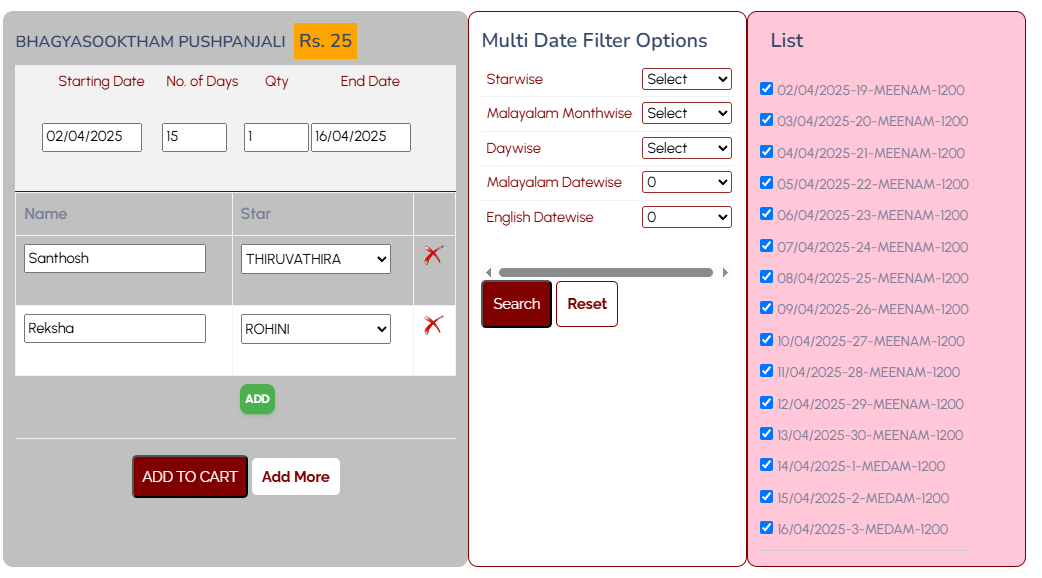 തുടർന്ന് മുകളിൽ വലതു വശത്തായി "Add-to-Cart" ക്ലിക്ക് ചെയ്താൽ സെലക്ട് ചെയ്ത വഴിപാടുകൾ ലിസ്റ്റ് ചെയുന്നതാണ്. കൂടുതൽ വഴിപാടുകൾ ചേർക്കണമെങ്കിൽ ക്ലിക്ക് ചെയ്തു വേണമെങ്കിൽ ചേർക്കാവുന്നതാണ്.