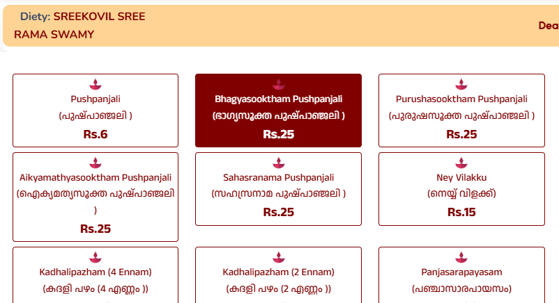 ആദ്യം പ്രതിഷ്ഠ ക്ലിക്ക് ചെയ്തതിനുശേഷം ആവശ്യമുള്ള വഴിപാടുകൾ select ചെയ്യുക
